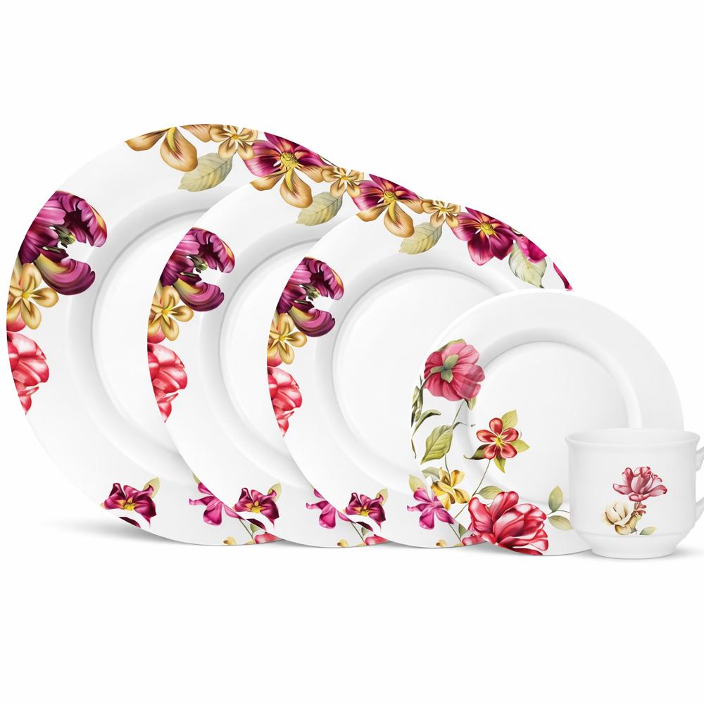 Haüskraft -Aparelho de jantar jardin 20 peças : Contém: 4 Pratos de sobremesa: 19 x 19 x 2cm ;4 Pratos fundos: 20,5 x 20,5 x 3,5cm; 4 Pratos rasos: 27 x 27 x 2,5cm; 4 Xicaras de Chá: 11 x 8,5 x 6cm; 4 Pires: 15 x 15 x 2cm. Material: Porcelana . Cor: Branco, Preto .Antes do uso: Lave a peça com detergente neutro e esponja macia. Evite quedas e pancadas para não danificar o produto. Perigos: Ao manusear produtos quentes, proteja as suas mãos.