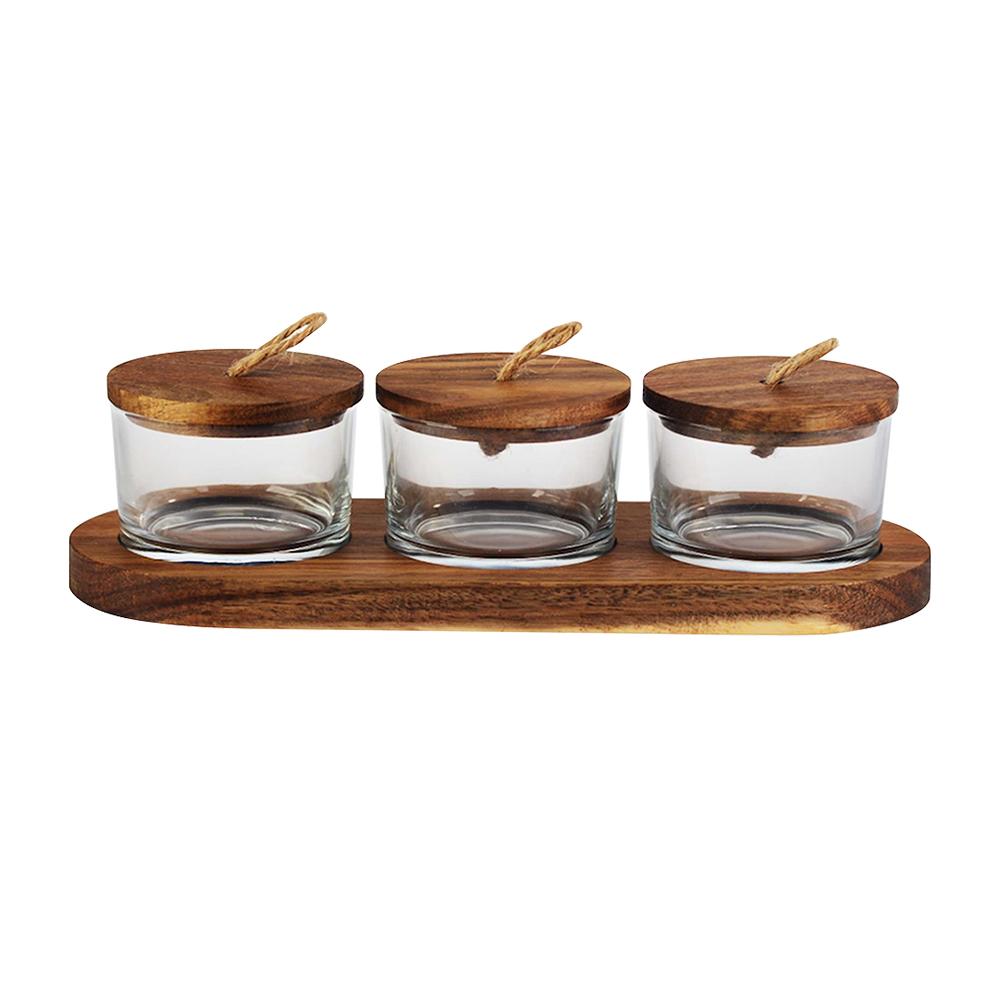 Jogo de 3 petisqueiras com tampa e suporte em madeira L'hermitage Wooden 120ml 4 peças