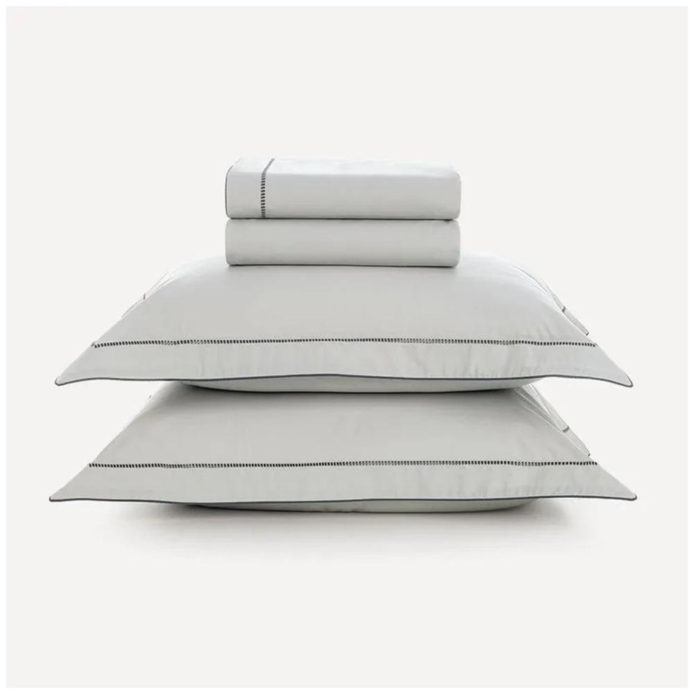O destaque fica por conta do delicado bordado Juno, um trabalho artesanal que adiciona uma elegância discreta e atemporal à sua cama. Ideal para quem busca um refúgio de tranquilidade sem abrir mão da beleza e da qualidade superior.
