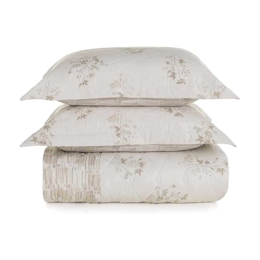 Design Delicado e Atemporal: A colcha Corinne apresenta uma estampa sutil e encantadora com motivos botânicos em tons neutros, que se harmonizam facilmente com diversos estilos de decoração. Os detalhes em sua barra adicionam um toque de textura e modernidade, elevando o charme da peça. As duas fronhas coordenadas completam o conjunto, criando uma composição elegante e convidativa.